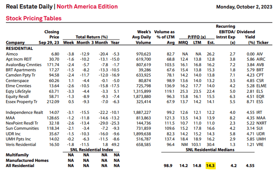 Fast-forward to September 29, 2023, and Sun Belt markets were expected to be squarely in the path of a multifamily supply tsunami. Rents would fall, vacancies would climb, and the sector price to FFO multiples contracted to about 14x.