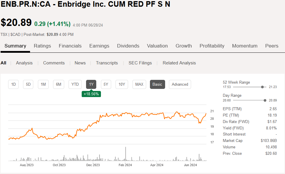 One of my “smart money” followers asked: ‘Assuming a 3% annual growth in dividends, would Enbridge’s common shares have higher perceived value than the company’s preferred over the next 5 years?’ This is a good question, and I decided to compare the perceived value of ENB:CA and CAD-denominated Series N (TSX:ENB.PR.N:CA, OTCPK:ENNPF) over the next 5 years. These preferreds recently underwent a reset of their yield and, for the next five years, are paying lucrative fixed dividends. As of December 1, 2023 (the reset date), the annual dividend increased by 31.7% from around $1.27 to $1.67 per share and on June 28 was yielding 8.01%. (All numbers are in CAD unless otherwise stated.)