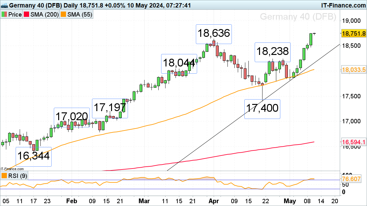 The DAX 40 has so far seen six consecutive days of gains which have taken it to a new record high on Friday morning with the 19,000 region being targeted.