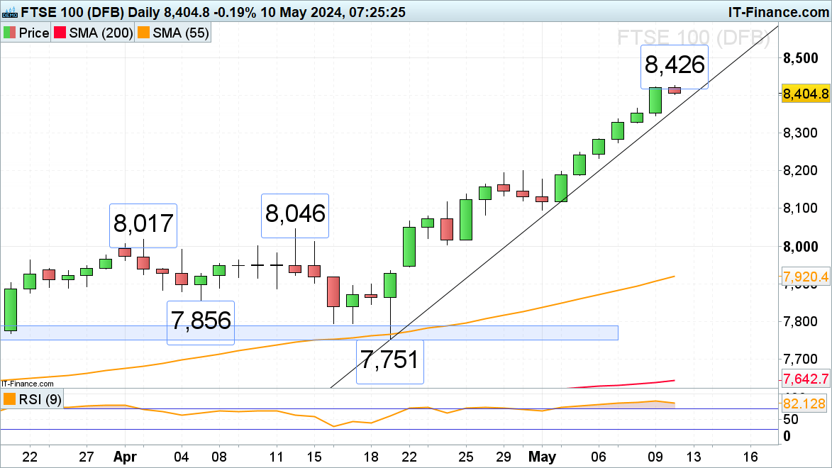 The psychological 8,500 mark represents the next upside target while the April-to-May uptrend line at 8,362 underpins.